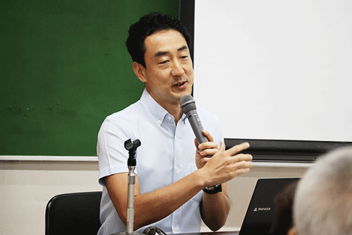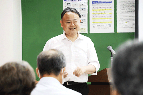 第1回は、8月1日(金)に酒井博臣助教が「フレイルにならないための運動、栄養について」と題して、フレイルとはどういう状態のことか、フレイルにならないための日常における運動・栄養の重要性について講演しました。講演の中で、なごや介護予防・認知症予防プログラムホームエクササイズを実施、その場でできる軽い運動をしていただきました。