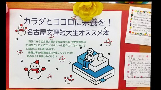 名古屋市西区にあります山田図書館にて、本学短期大学部で実施されたブックレビューが正面に展示されています。