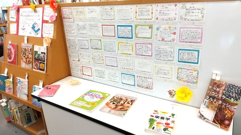 「カラダとココロに栄養を!」と題して本学のおすすめ本の紹介POPとともに、その本や関連する本が展示されています。
