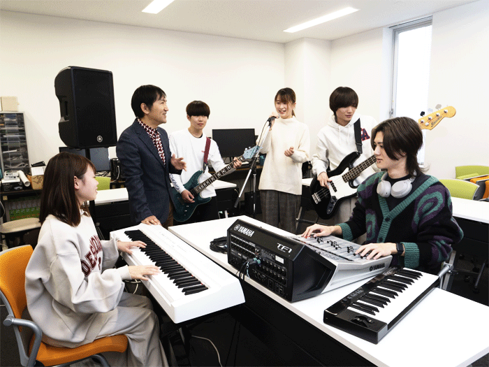 学内サウンドスタジオにてボーカルのレコーディングを行います。マイクなど録音機材の説明やPro Tools(DAW)を使用した波形編集、エフェクトの効果などを実際に見て聴いて感じてもらう模擬授業です。また同時にPAミキサーを使ったPA(音響)体験もできます。音楽制作現場の裏側をちょっとのぞいてみよう!