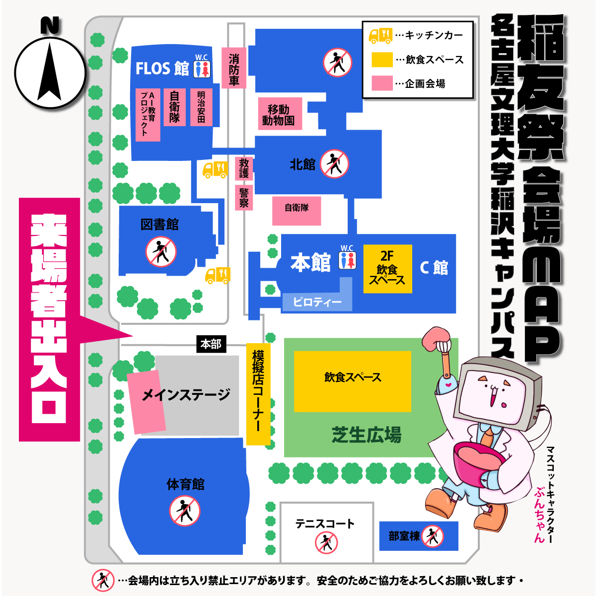 - 会場内は「健康増進法」に則り、全面禁煙です。喫煙所もございません。また、大学周辺道路等、公共の場所での喫煙も固くご遠慮ください。