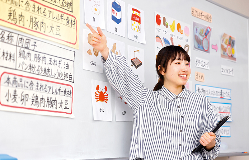 健康栄養学科では管理栄養士だけでなく、栄養教諭一種免状の資格取得もサポート。豊富な実習で、栄養教諭に必要な知識とスキルを身につけることができます。教員採用試験を受験する学生には、希望する自治体に合わせた試験対策をサポートしています。