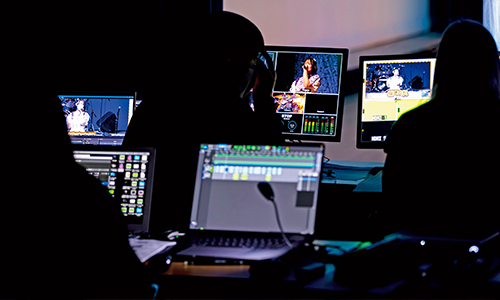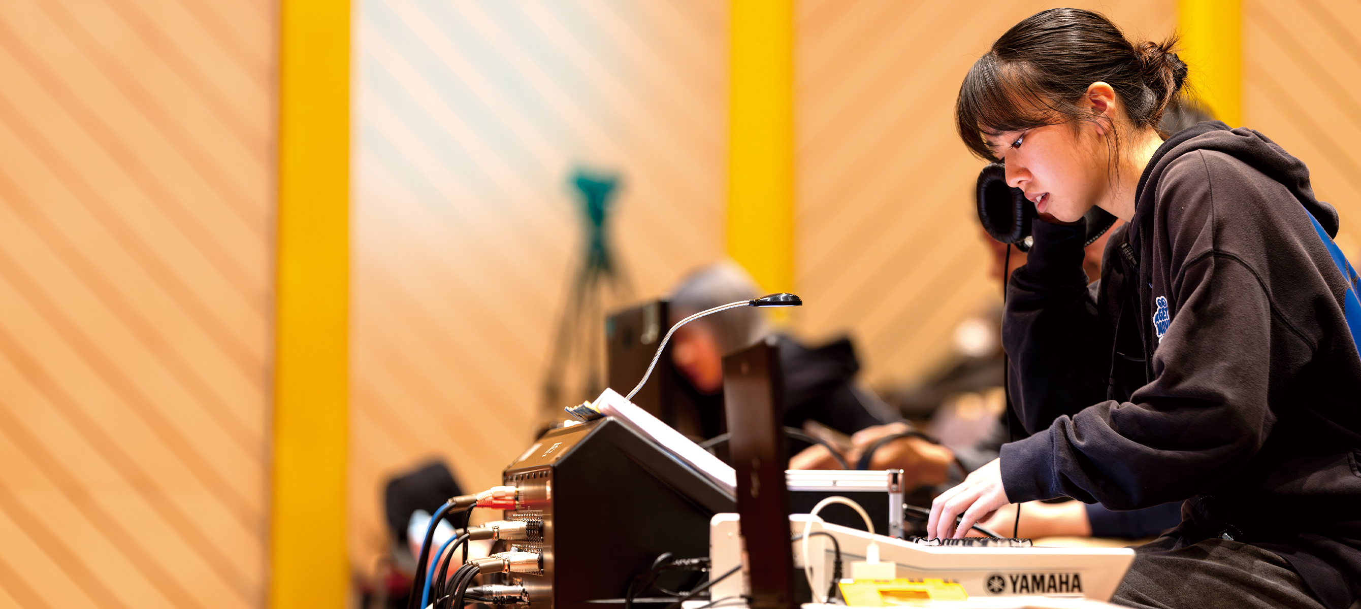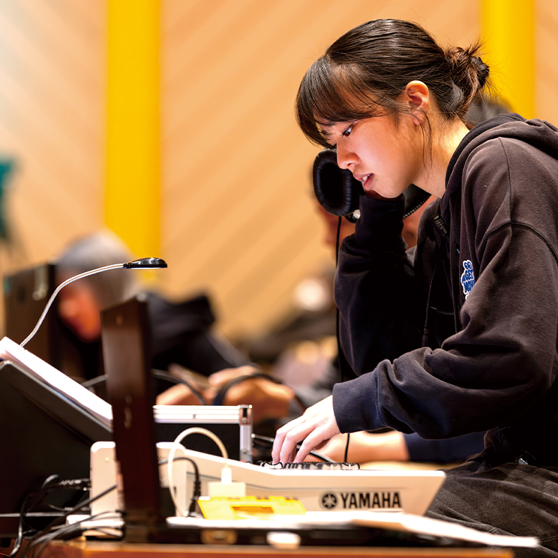 音響の奥深さとリアルな現場を肌で感じられるのが、このプロジェクト最大の魅力です。毎年恒例のコンサートは第19回目を迎え、2月に「Still on the way〜俺たちのミュージックはこれからだ〜」を開催しました。音響のプロとして活躍する先生が、機材の操作技術から、マイク1本の配置で変わる音の響き、円滑な進行に欠かせない演者との対話まで徹底的にアドバイス。学生が主体となって、充実した設備環境の中で試行錯誤しながらホール公演を作り上げます。本番ではチーム全員が一丸となり、音楽や舞台を支える誇りと楽しさを実感しました。