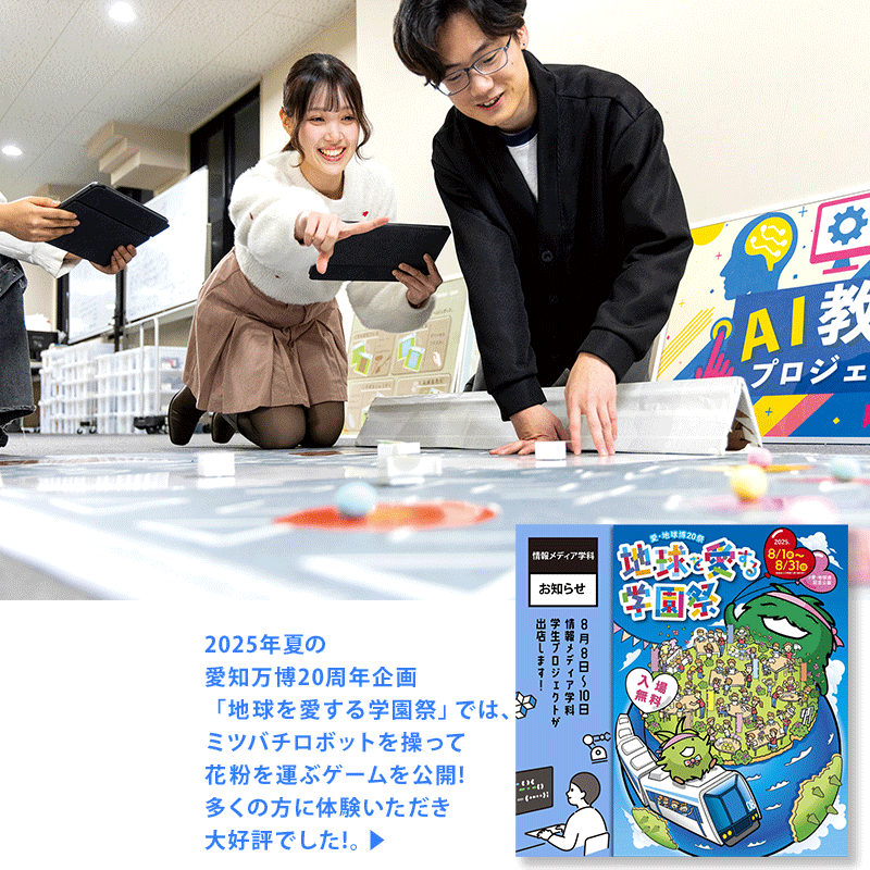 コード教育では、小型のロボットを使って小学生向けプログラミング教育を開催。教材を開発し、2025年には「愛・地球博20祭」などのイベントにも出展予定です。高校教員を目指す情報教育プロジェクトでは高校「情報」の教育を研究し、学会や研究会で研究成果を発表して他大学の研究者とも交流しています。