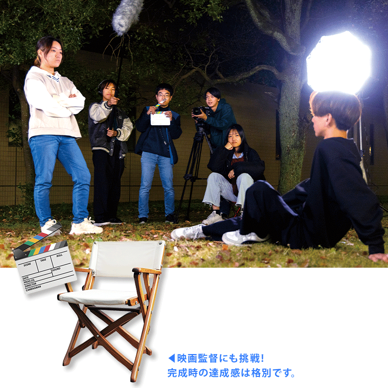 機材の基礎知識や使い方を学び、監督・脚本・カメラ・音声などメンバーと役割を分担して映画やSNS動画の制作に取り組みます。秋の稲友祭(学園祭)では、学生の映画作品を上映する「稲映会」で2作品を出品。『完全犯罪』は密室犯罪の謎を解くミステリー・サスペンス映画、『恋の大戦争』はライバル同士で戦うコメディ映画です。現在は海外のコンペ出品を目指し、英語字幕を制作中!