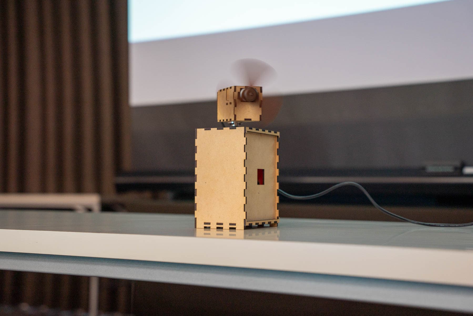 2つ目は、グループで話し合いをする際に、AIがグループの会話を検知して、専用デバイスに取り付けられた扇風機が回るというシステムです。話し合いが続くと扇風機が回って、グループメンバーに心地よい風が送られ、会話が途切れると自動的に止まって室温が上がるという仕組みです。扇風機を止めないようにするために会話が活発になり、グループディスカッションの活性化を促す効果が期待されます。