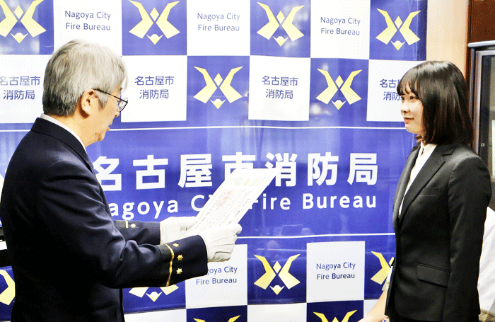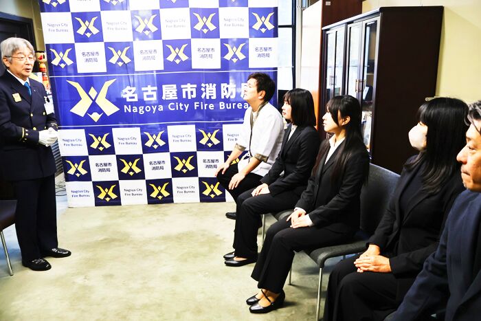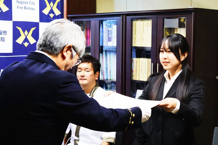 贈呈式は名古屋市消防局長室にて執り行われ、名古屋市消防局の消防局長伊藤一義様より、大久手山本屋 専務取締役 青木裕典様をはじめ、本学中村ゼミ代表学生1名、木村ゼミ代表学生1名まで、感謝状が直接手渡されました。