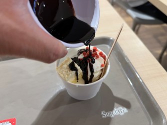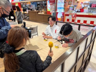 参加した学生の多くは、完成版の「しろふわショコラ」を食べるのが初めてです。学生たちは、スガキヤの方々に準備していただいた商品に、温かいチョコレートソースをかけながら美味しそうに食べていました。同時に、実際に店頭でお客様に提供されているところを目の当たりにし、自分たちが関わった商品が本当に商品化されたのだという実感を噛みしめていました。また、当日は三重テレビの密着取材も行われました。