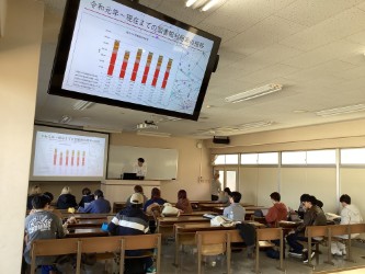 全学科対象基礎教育科目「地域の課題」(担当教員:栗林芳彦教授)では、学生が地域の課題について学び、それに対する解決策を自ら考えることによって、市民と行政の在り方についての理解を深めることを目的としています。授業は、稲沢市役所の担当課からのオリエンテーションを受けた後、グループで議論し、課題の解決法をプレゼンテーションする形で進められます。
