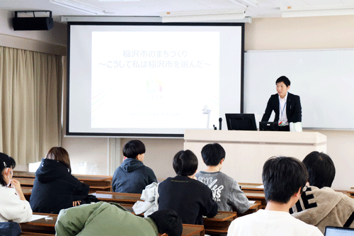 令和7年11月30日(金)、稲沢市秘書政策課様にお越しいただき、最後となる3つ目の課題のオリエンテーションが行われました。今回のテーマは「居住地として稲沢市が選ばれるためにはどうしたらよいか」というもので、最初に稲沢市の現状や課題について解説していただいた後自分は将来どのような生活を望むか、そして将来、稲沢に住んでいると仮定して、稲沢を選んだ理由や、稲沢の生活の様子などを各自がエッセイにまとめ発表するという課題が提示されました。