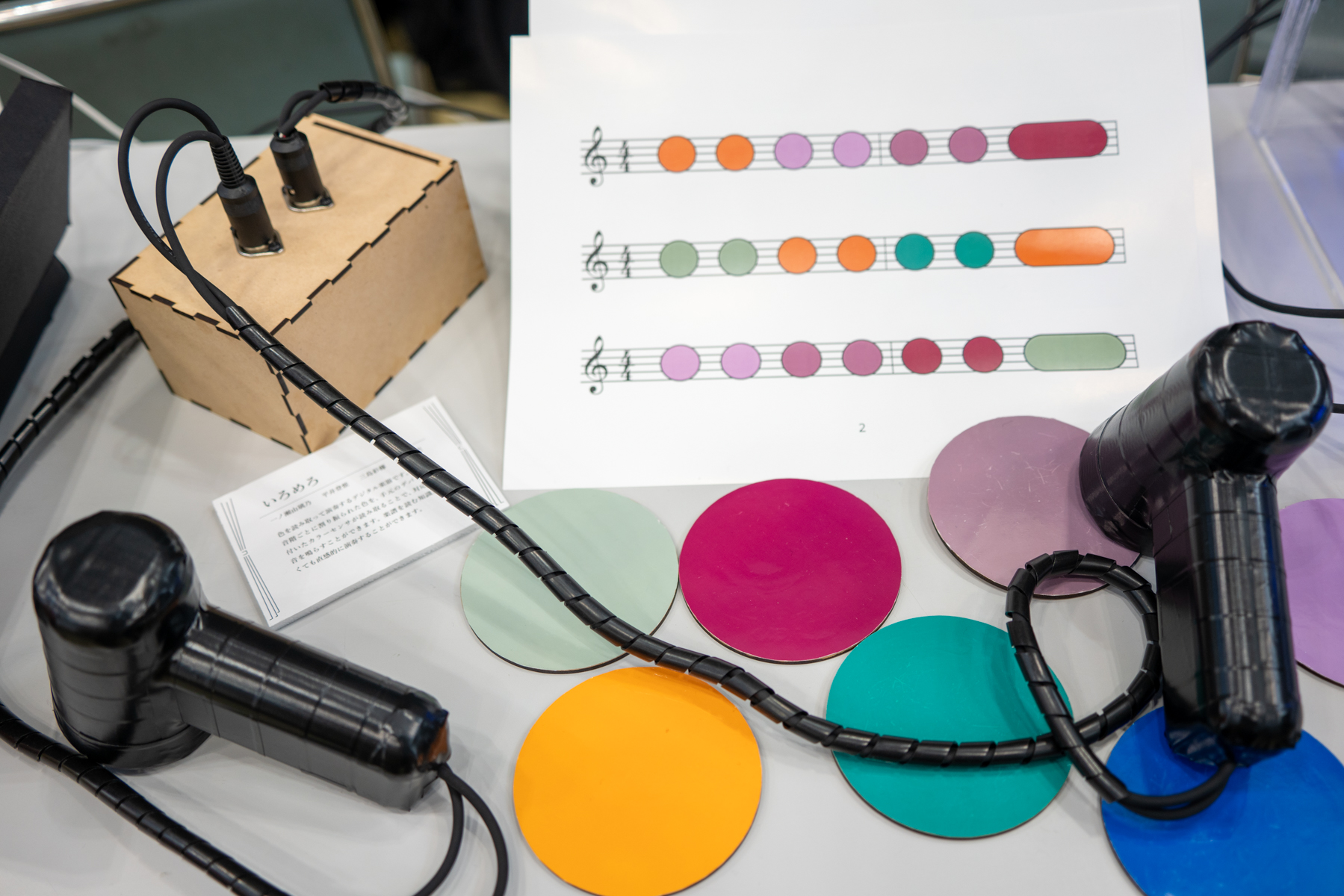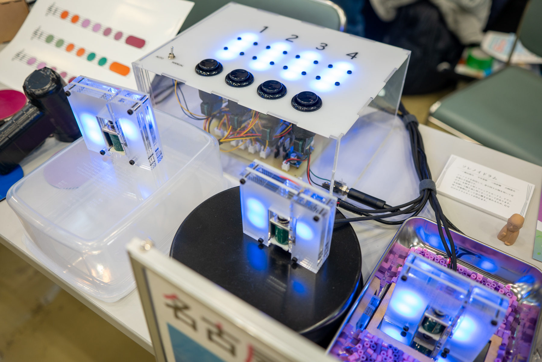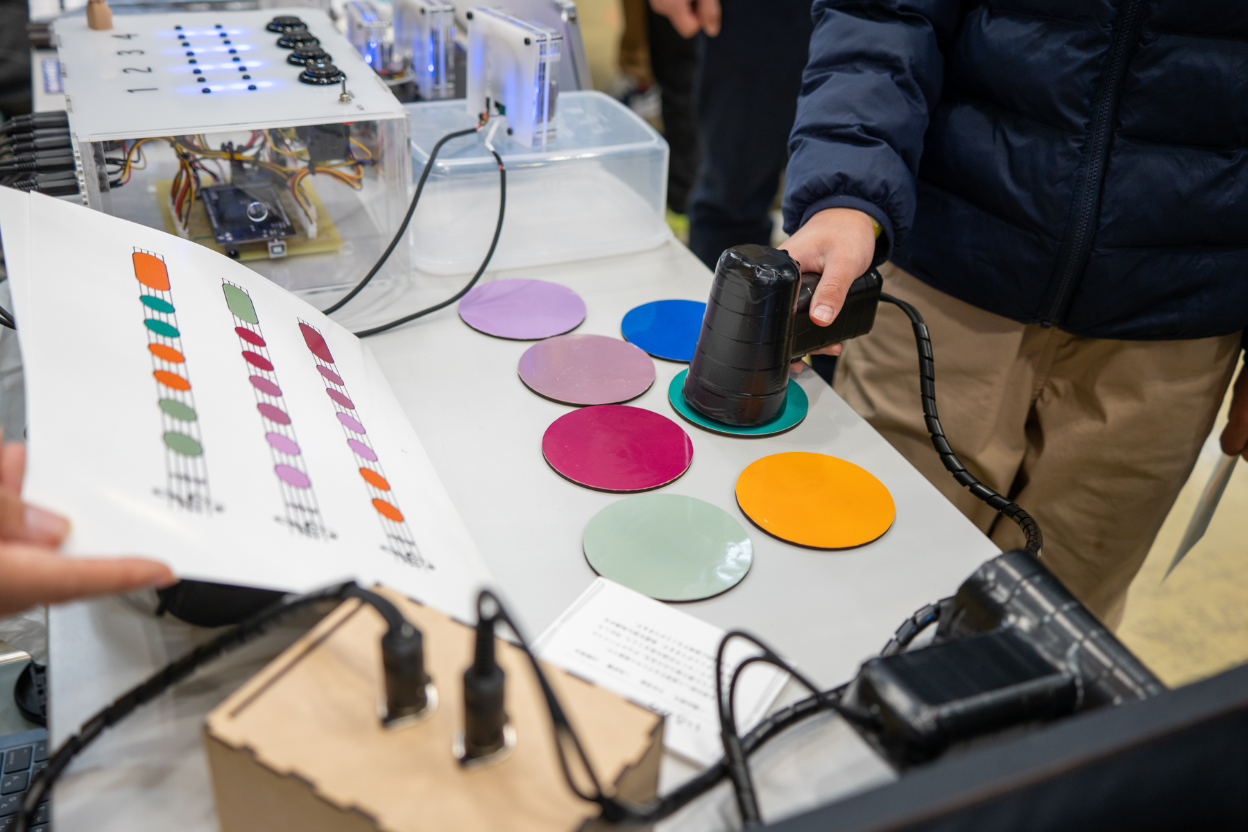 まず、2025年10月に本学情報メディア学科・石郷ゼミが名古屋商科大学「三ヶ峯祭」のステージ演奏した際に使用したオリジナル楽器2作品を展示しました。オリジナル楽器のひとつは、ソレノイド(電磁力で鉄心を動かす電子パーツ)を用い、100円ショップなどで購入した身近な素材を叩いて音を出す楽器です。もうひとつは、カラーセンサで読み取った色に応じて音を鳴らす楽器となっています。