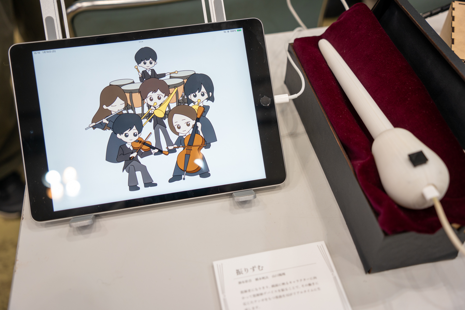 また、これらに加えて、指揮棒デバイスを振ることで、そのテンポに応じた音楽をAIが自動生成する作品を展示しました。