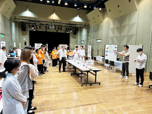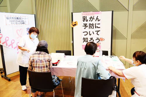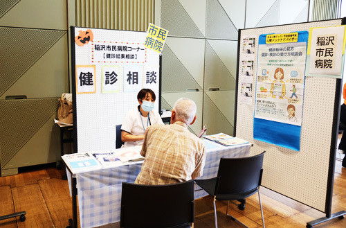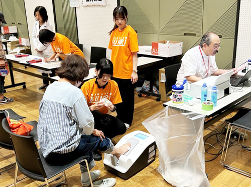 本学は、握力測定、骨密度測定、身長測定、体組成測定、栄養相談、キッズコーナー(豆つかみゲーム、科学実験体験)を設け、来場者の方々に健康チェック等を行っていただきました。また、ご協力いただきました稲沢市民病院様には、便潜血検査模擬体験や乳房モデルを利用したセルフチェック体験、保健師(人間ドックアドバイザー)による健診結果相談を設けていただき、来場者に健康の大切さをご紹介いただきました。