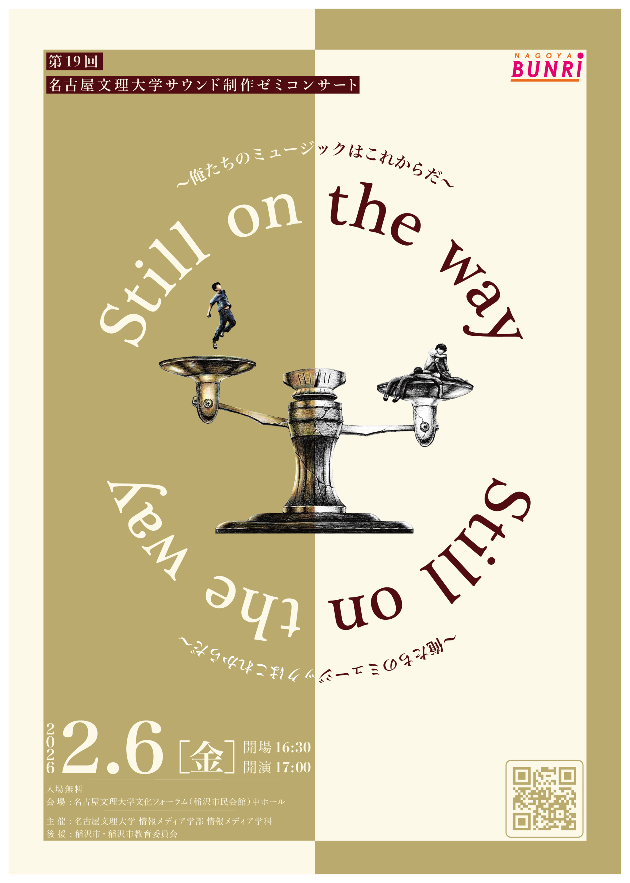 来る2月6日(金)に名古屋文理大学文化フォーラム(稲沢市民会館)中ホールで、名古屋文理大学情報メディア学科サウンドゼミ卒業研究発表会「第18回サウンドゼミコンサート「Still on the way ~俺たちのミュージックはこれからだ~」を開催します。