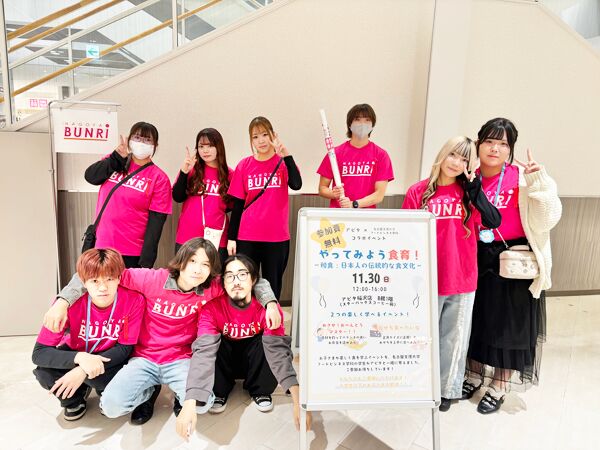 令和7年11月30日(日)、フードビジネス学科2年生の学生9名がアピタタウン稲沢様にて産学連携イベント【第17回 やってみよう食育!~和食:日本人の伝統的な食文化~】を開催し、約130名のお客様にご参加いただきました。