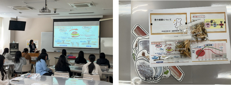 骨の強さや代謝について講義を聞いたあと、食材カードを用いてカルシウムが多く含まれている食材を選んでいただく、演習形式の内容でした。骨の特徴を知り、どのような食材にカルシウムが多く含まれるのか理解を深めることができたのではないでしょうか。